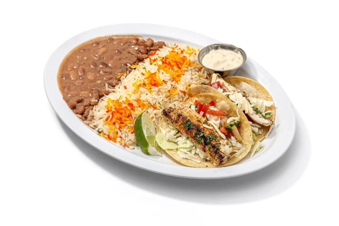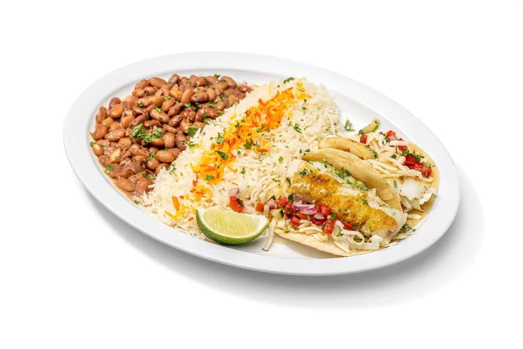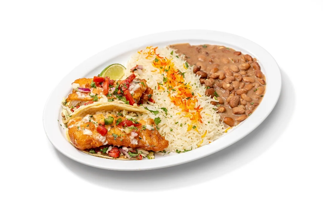 Battered Alaskan cod wrapped in flour tortilla with Mojo sauce, basmati rice, pinto beans, cabbage, jack cheese and pico de gallo