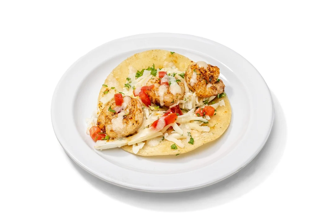 Grilled shrimp on a corn tortilla with Mojo sauce, cabbage, pico de gallo, garlic sauce and jack cheese