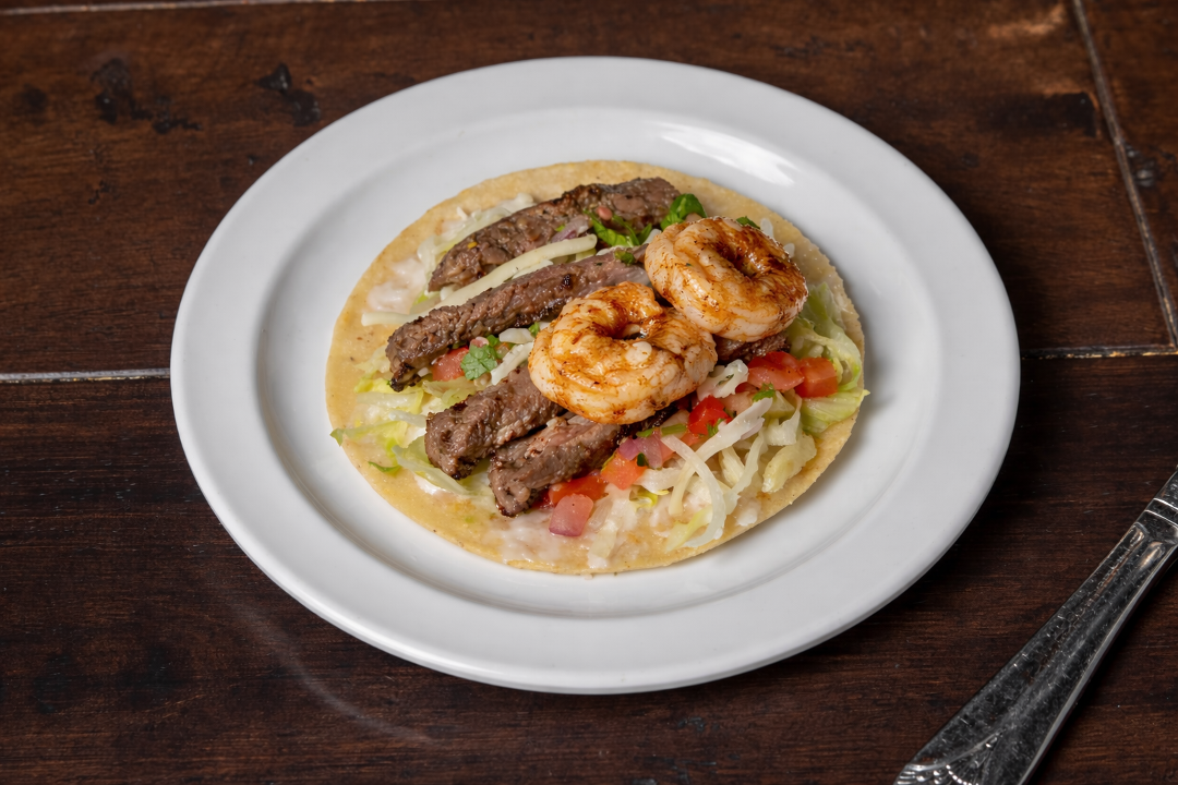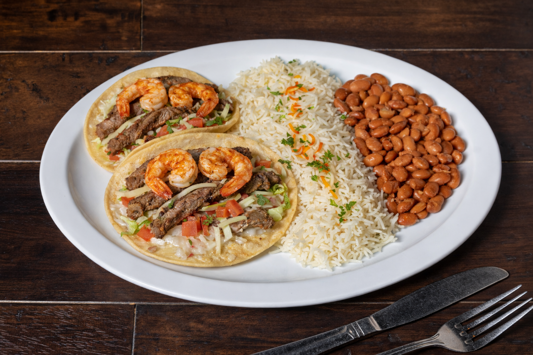 Filet-mignon and grilled shrimp on a corn tortilla with cabbage, pico de gallo, garlic sauce and jack cheese
