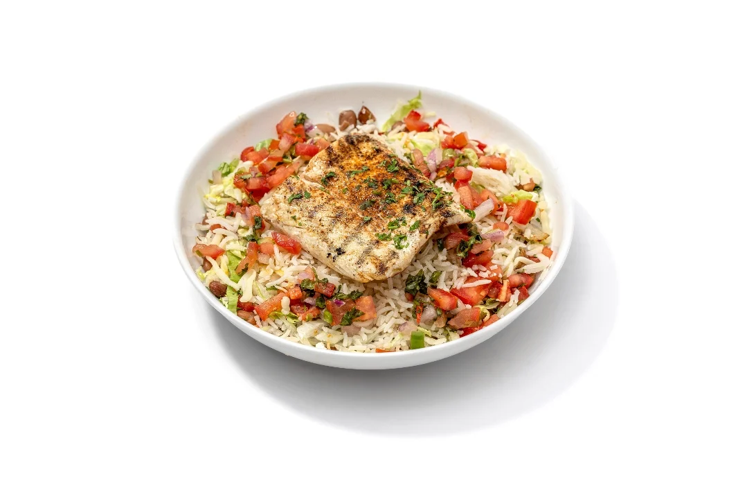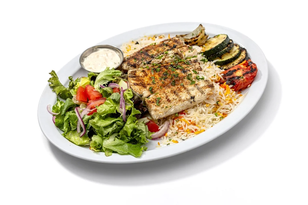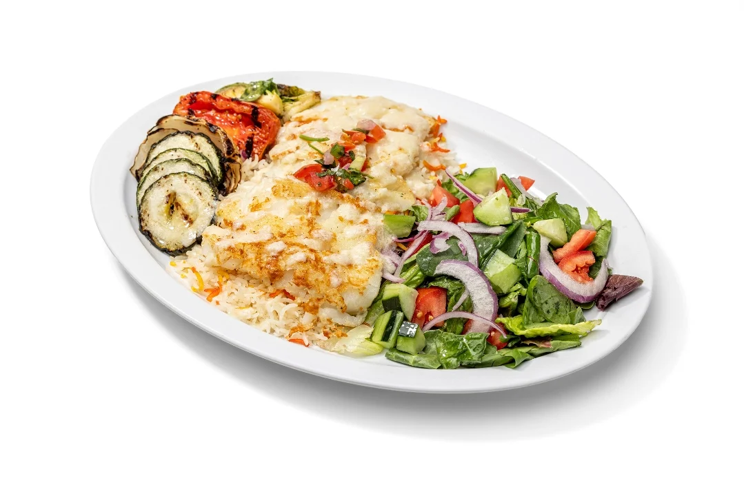 Grilled Alaskan cod topped with Mojo sauce and pico de gallo. Served with basmati rice, grilled veggies and salad