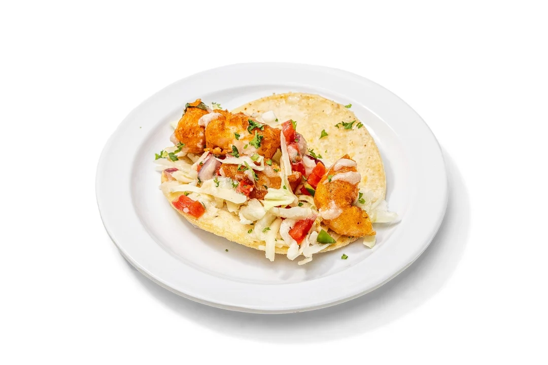 Battered shrimp on a corn tortilla with Mojo sauce, cabbage, pico de gallo, garlic sauce and jack cheese