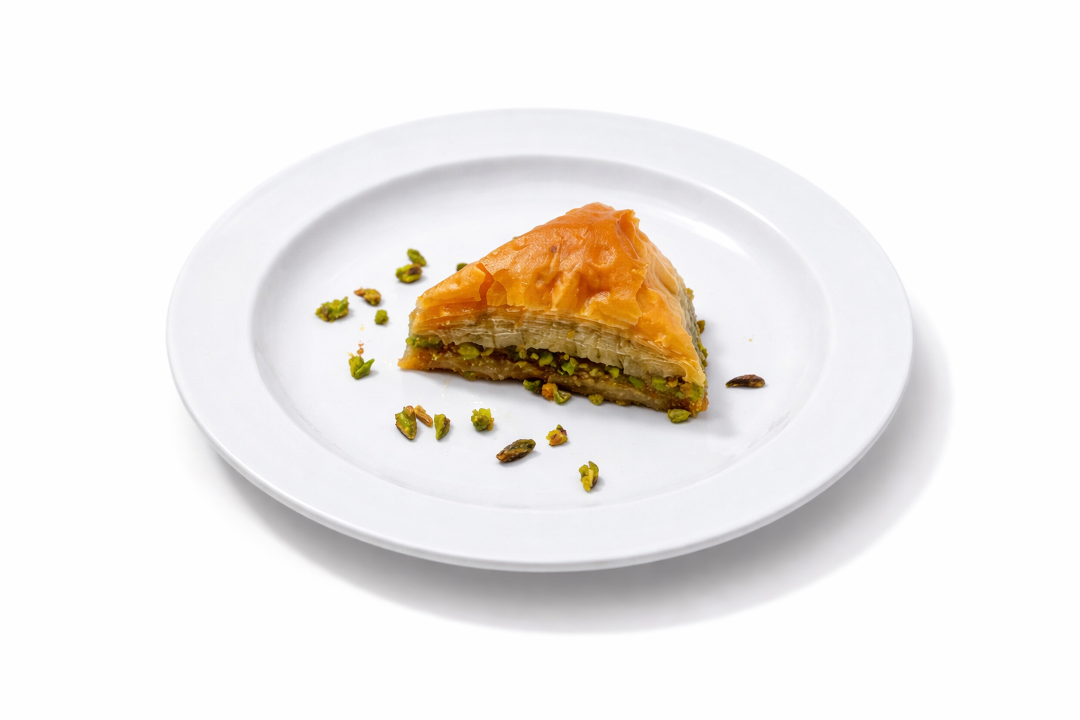 Layered phyllo dough and crushed pistachios baked in sweet syrup