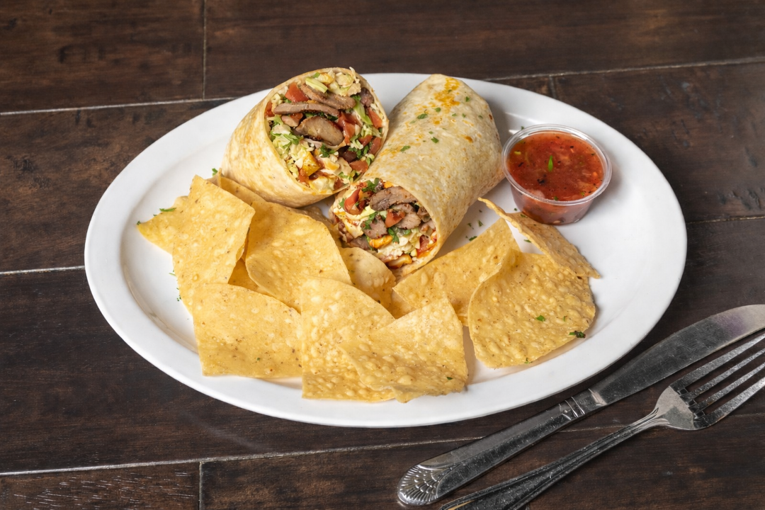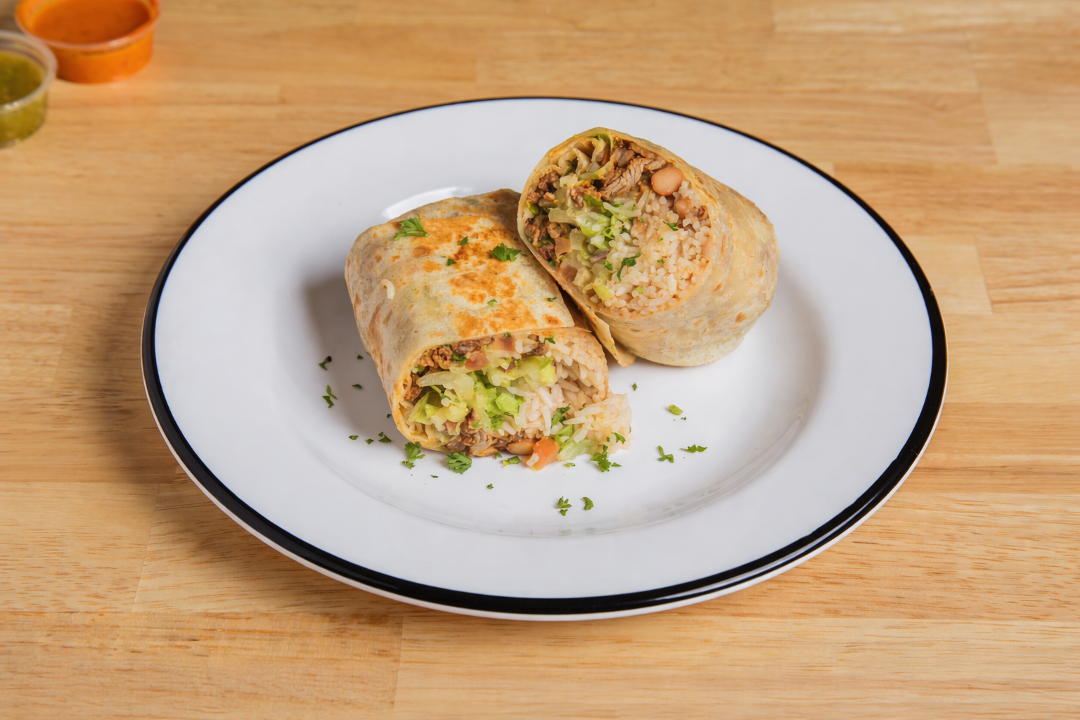 Char-broiled filet-mignon wrapped in flour tortilla with basmati rice, pinto beans, lettuce, jack cheese and pico de gallo