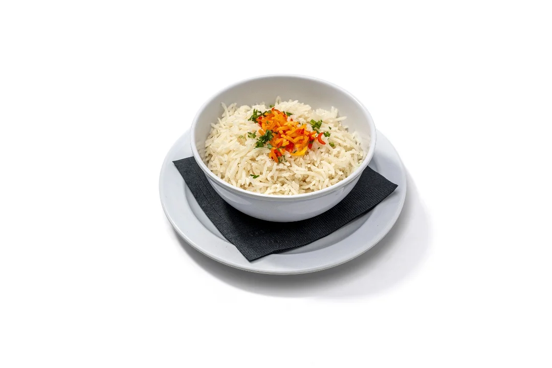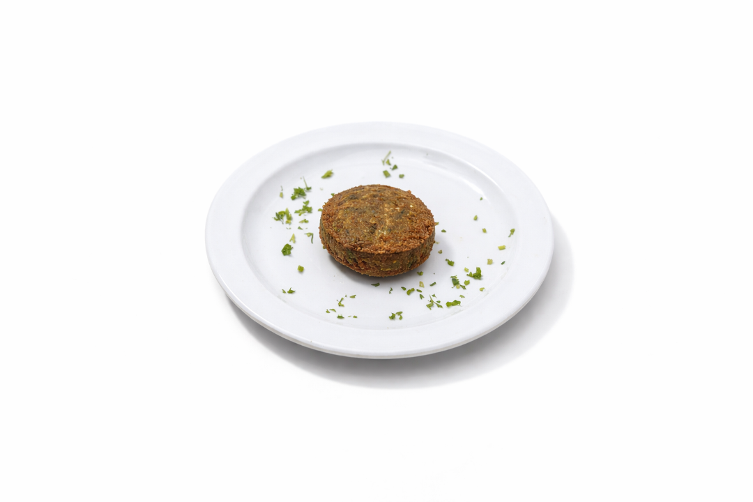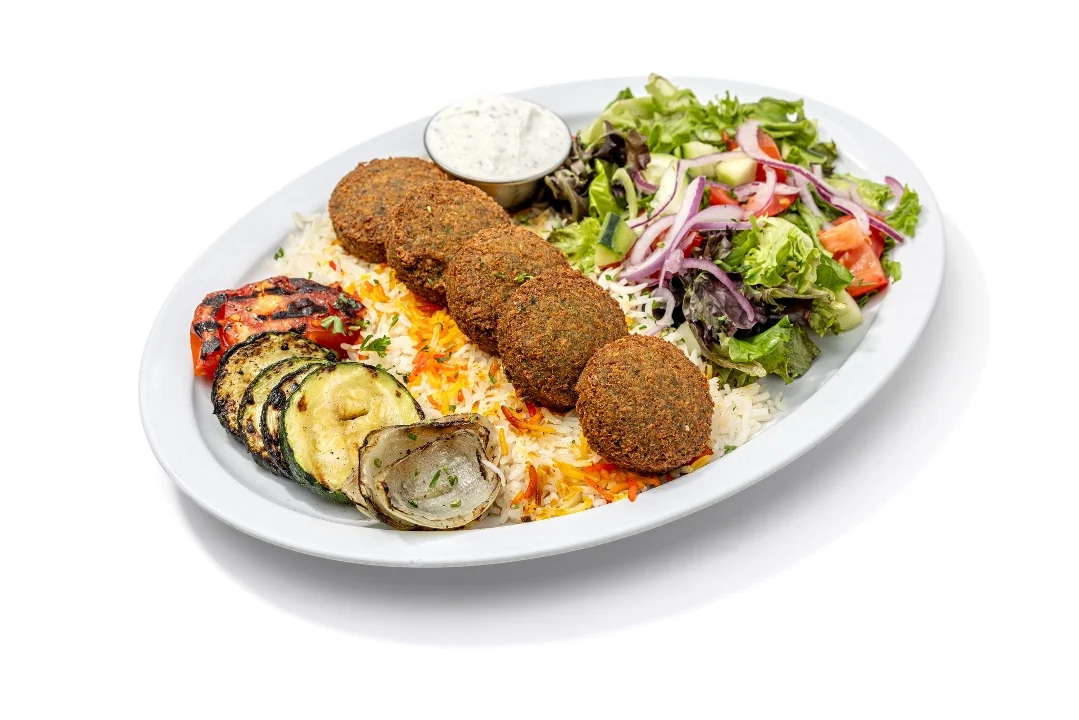 Five pieces of fresh-made falafel. Served with basmati rice, grilled veggies and salad. Falafel: Garbanzo beans/chickpeas ground with veggies and fried in olive oil