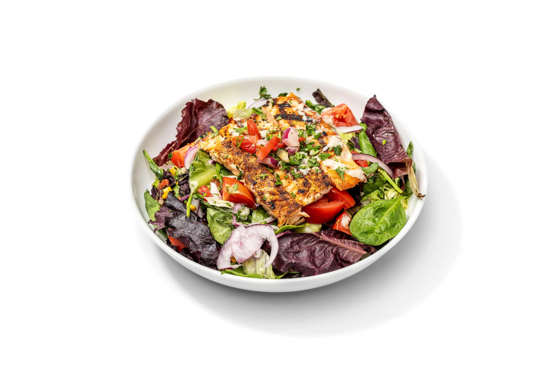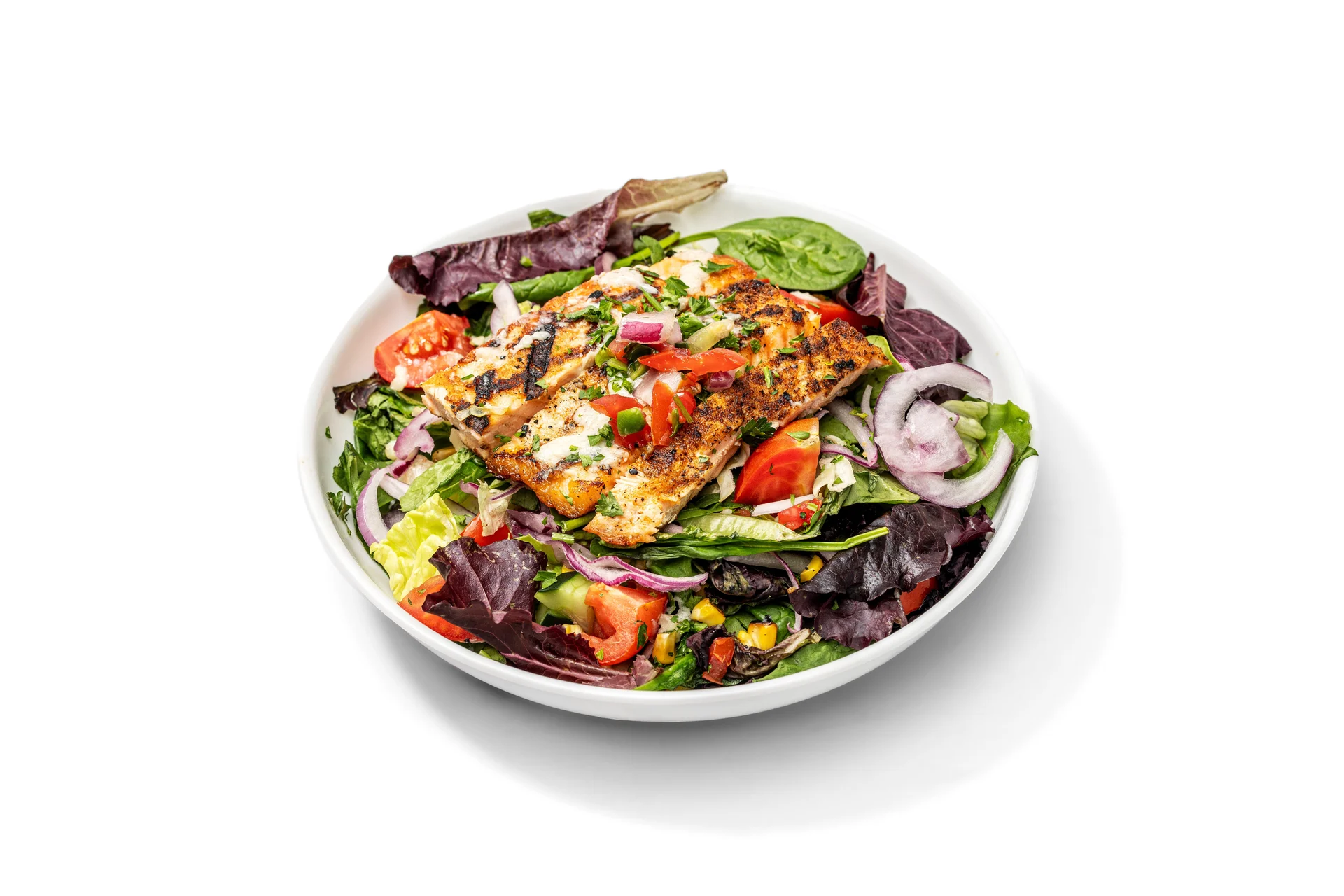 Grilled salmon topped with Mojo sauce and pico de gallo. Served on mixed greens with tomatoes, cucumbers, red onions and fire roasted corn
