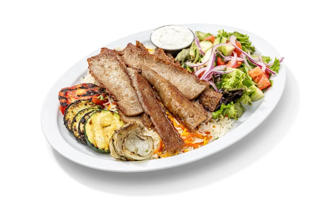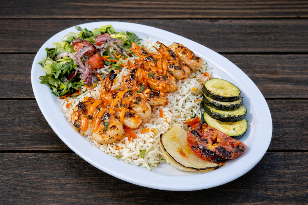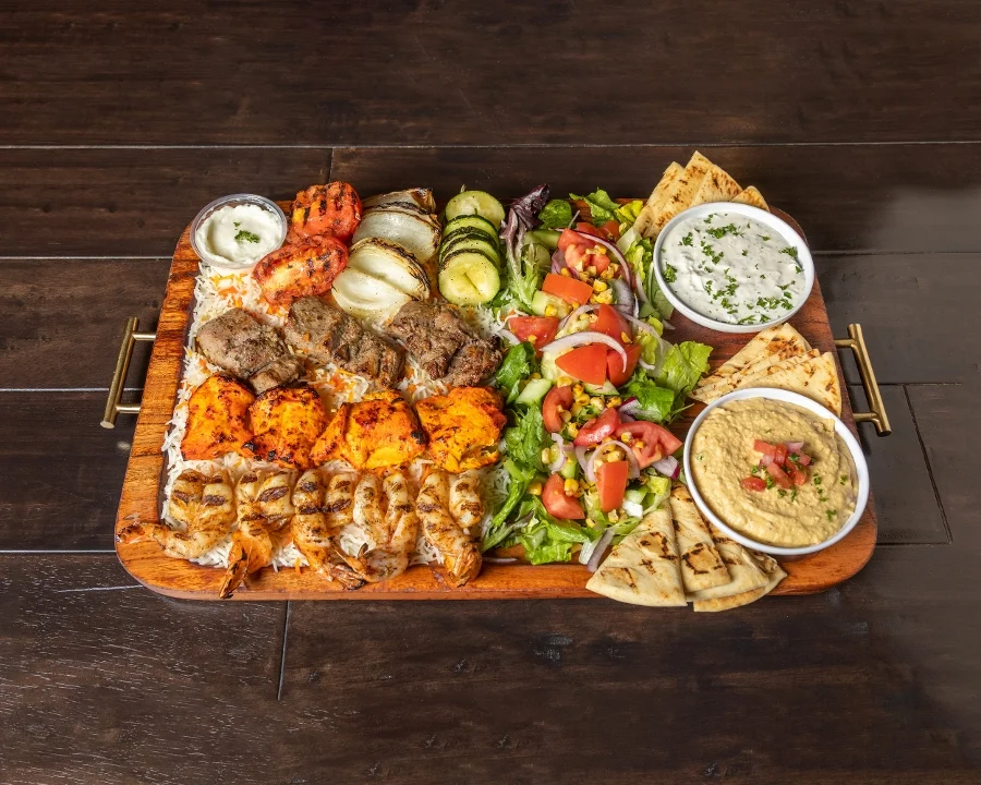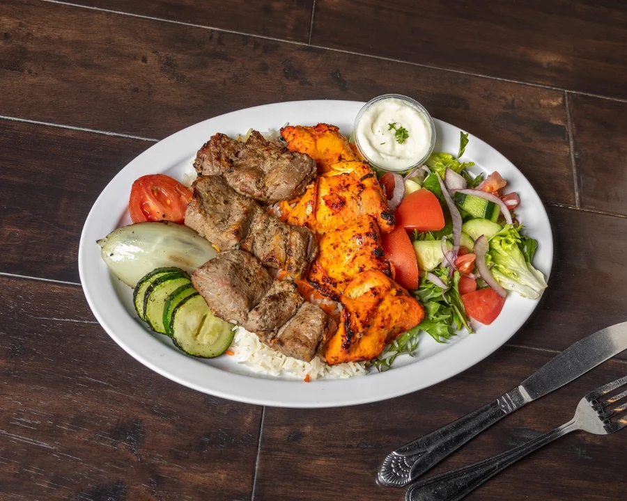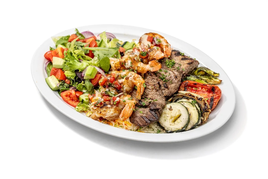 Chicken kabob, filet-mignon kebab, and five large grilled shrimp. Served with basmati rice, grilled veggies, lemon-oregano salad, hummus, tzatziki & pita bread