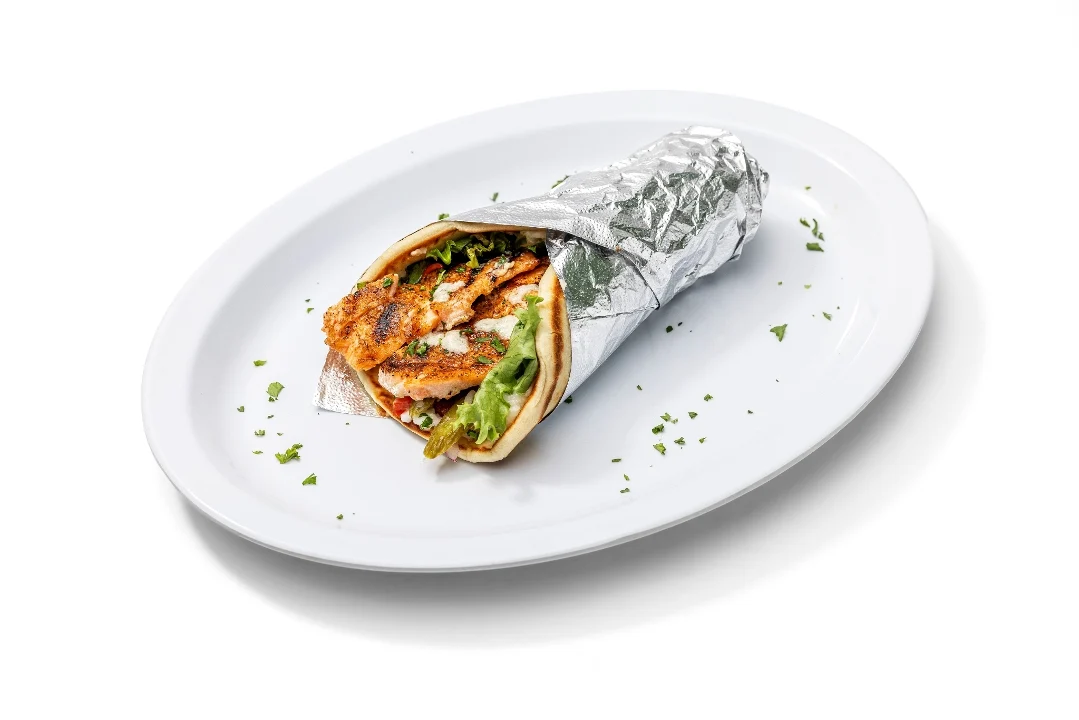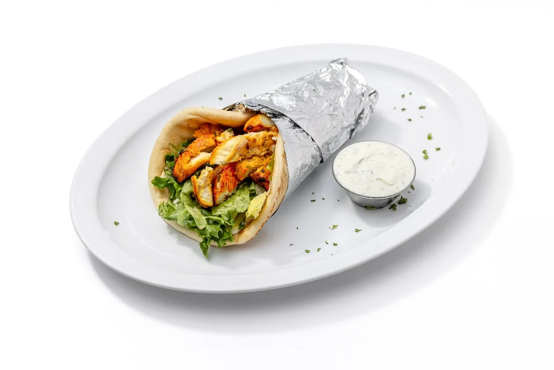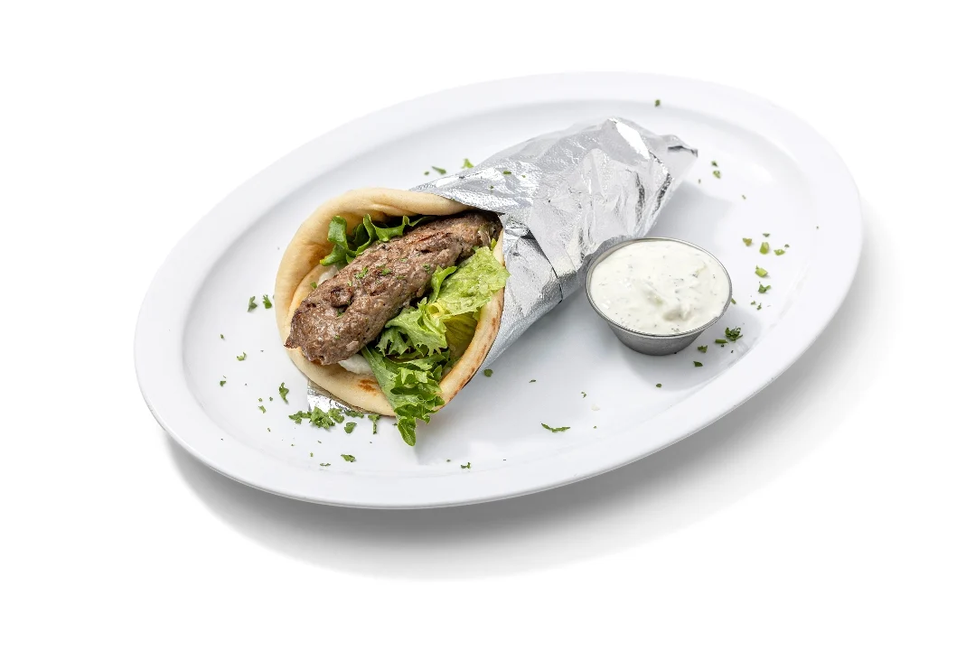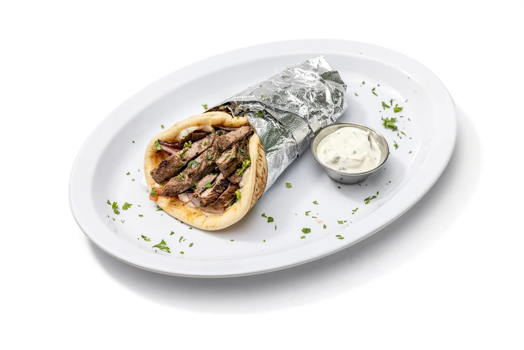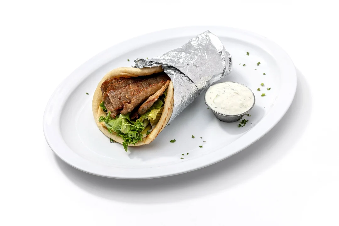 Lamb gyro cooked and sliced off a vertical grill. Wrapped with mixed greens, tomatoes, red onions, pickles and garlic sauce