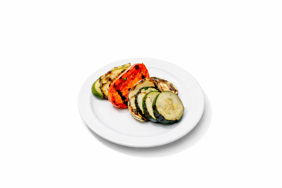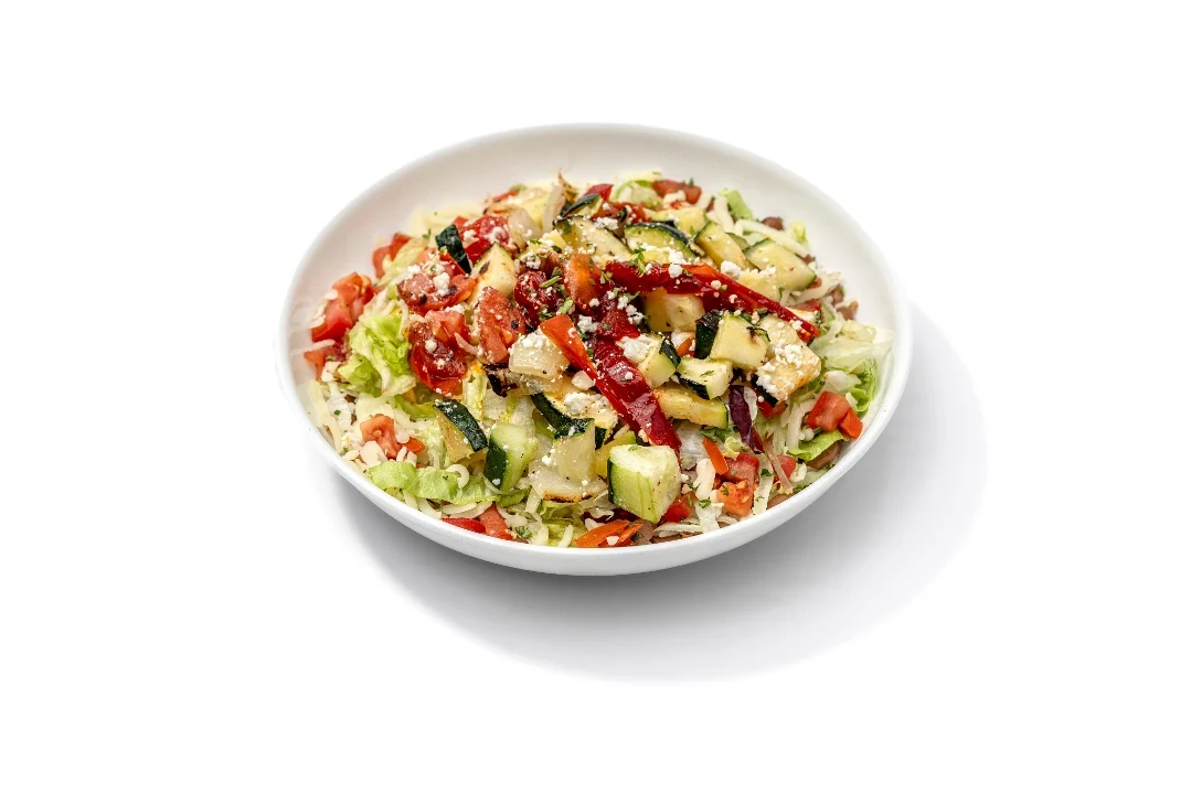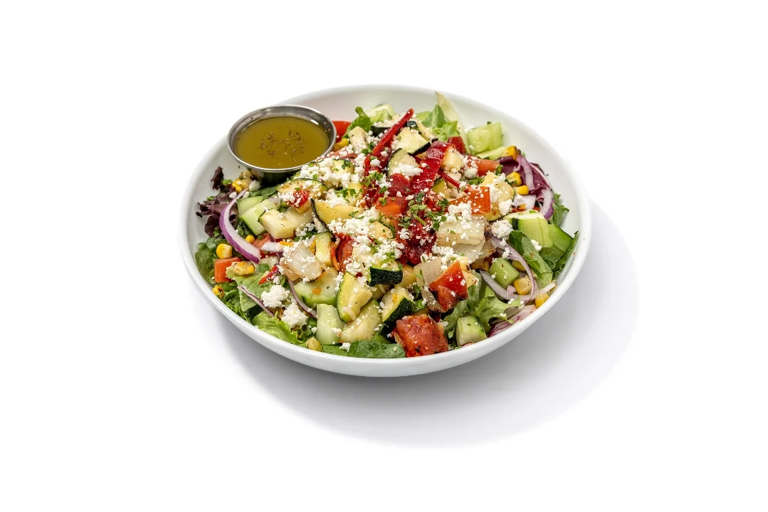 Grilled zucchini, tomatoes, onions, roasted red pepper and feta cheese. Served on mixed greens with tomatoes, cucumbers, red onions and fire roasted corn