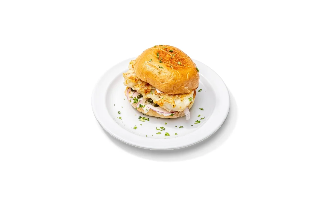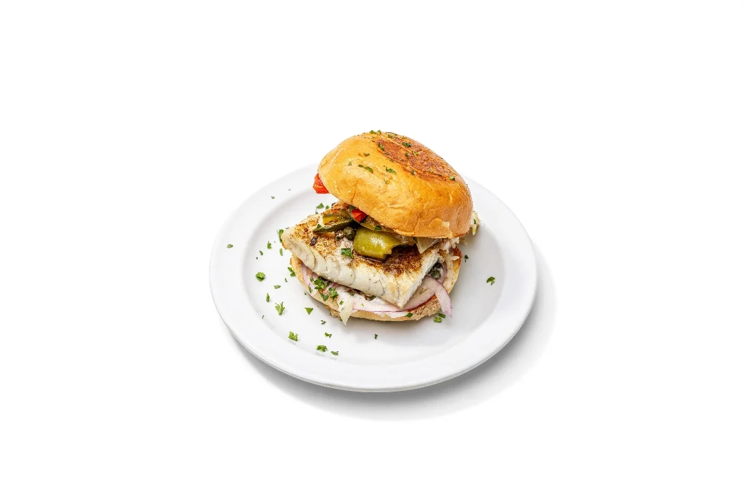 Grilled mahi-mahi on a brioche bun with Mojo sauce, capers, onions and Krazy sauce