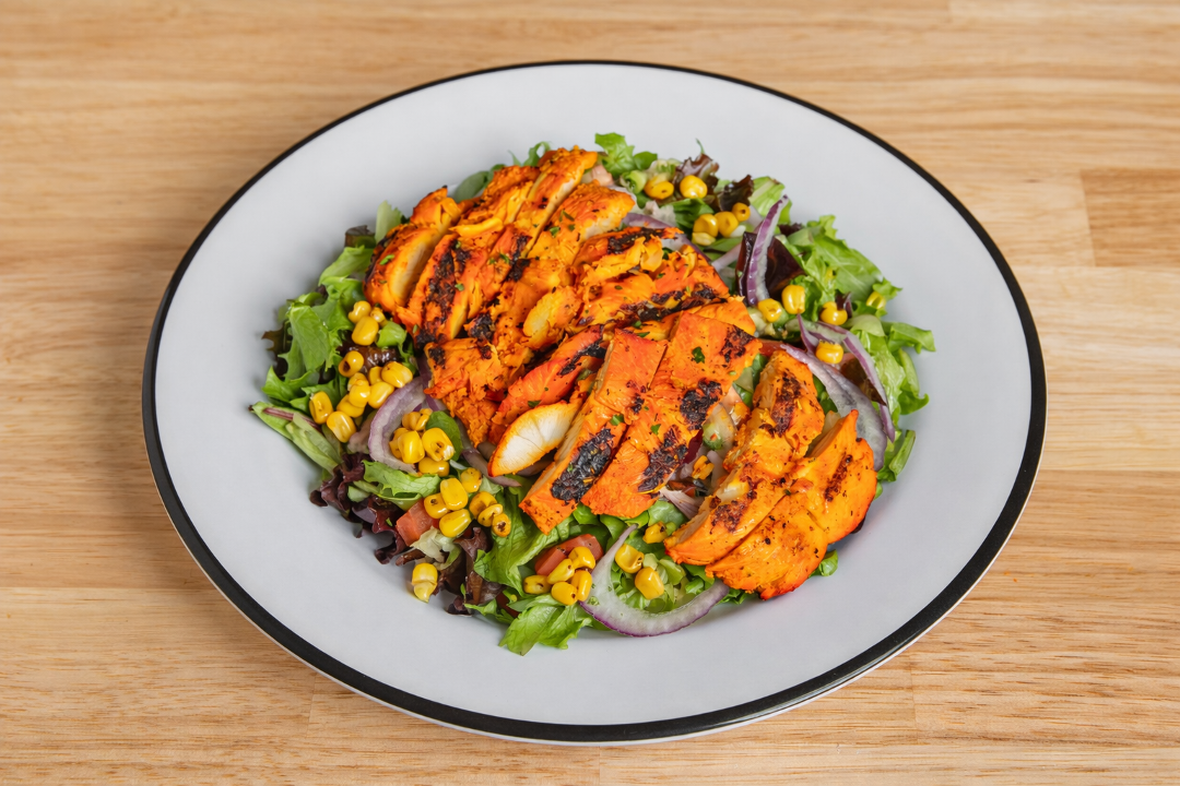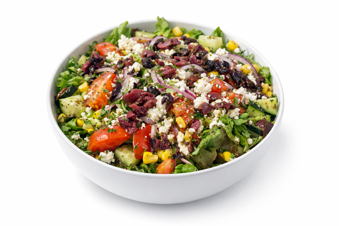 Feta cheese, Kalamata olives, mixed greens, tomatoes, cucumbers, red onions and fire roasted corn