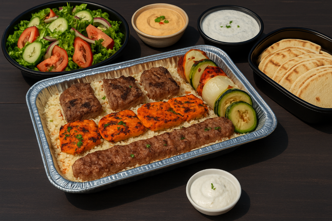 Three kabobs: filet-mignon, chicken & ground sirloin. Served with basmati rice, grilled veggies, salad, hummus, tzatziki & pita bread