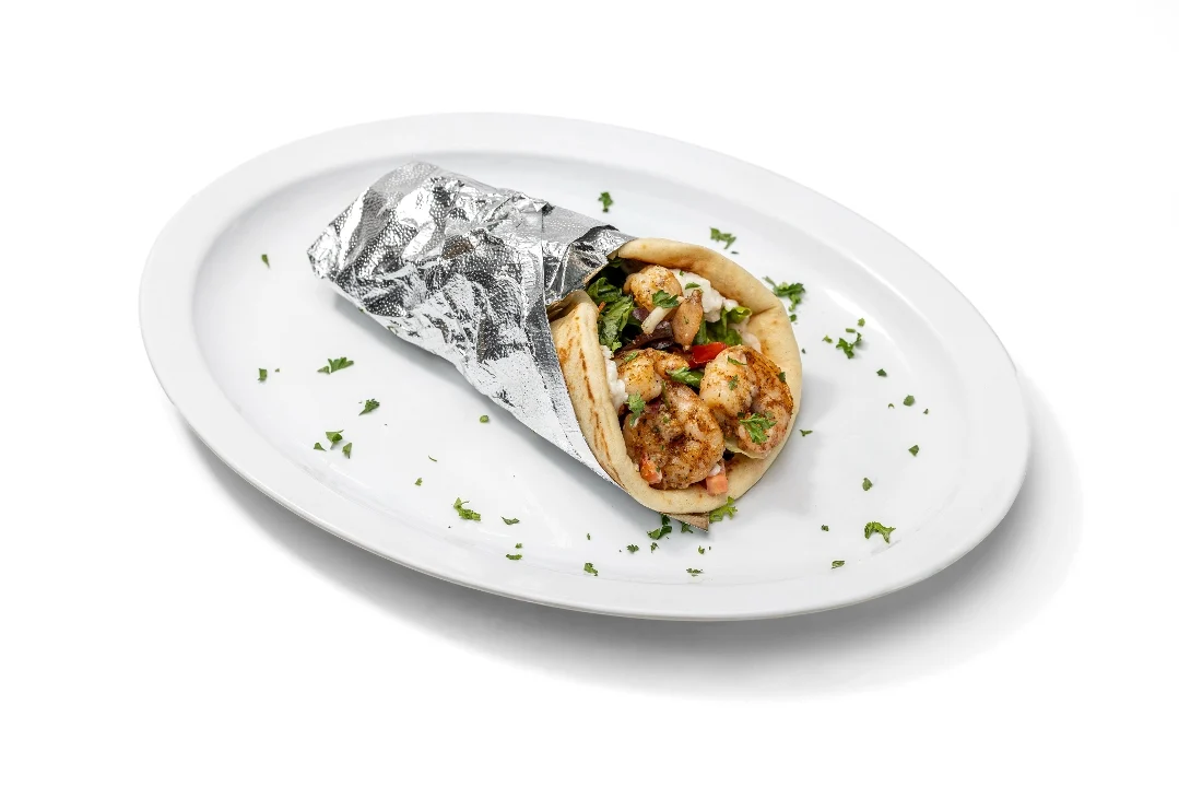 Grilled shrimp topped with Mojo sauce. Wrapped with mixed greens, tomatoes, red onions, pickles, pico de gallo and garlic sauce