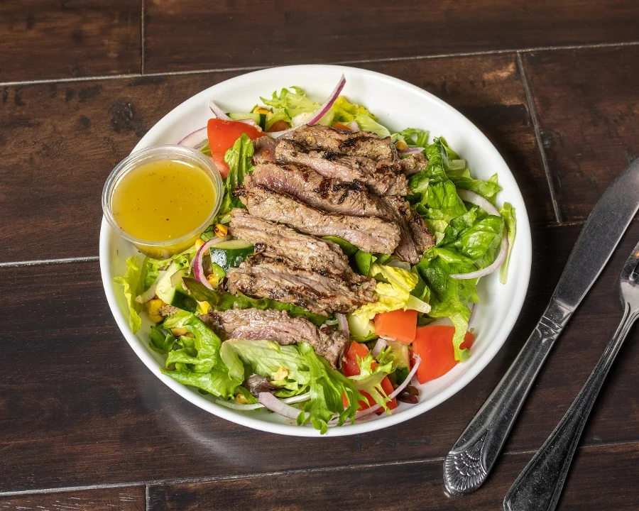 Char-broiled filet-mignon on mixed greens with tomatoes, cucumbers, red onions and fire roasted corn