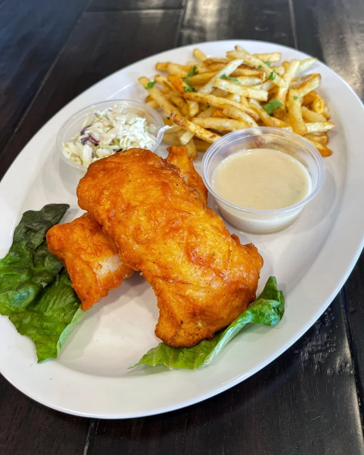 Battered Alaskan cod, seasoned fries and coleslaw