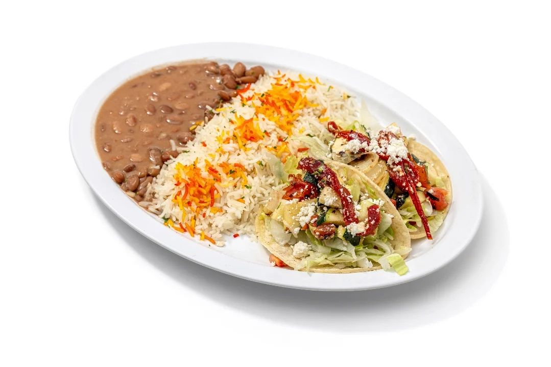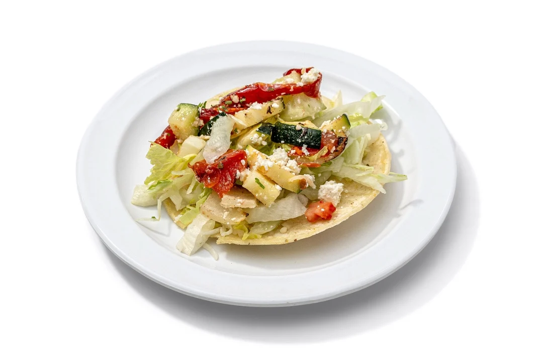 Grilled zucchini, tomatoes, onions, roasted red pepper and feta cheese. On a corn tortilla with lettuce, pico de gallo, garlic sauce and jack cheese