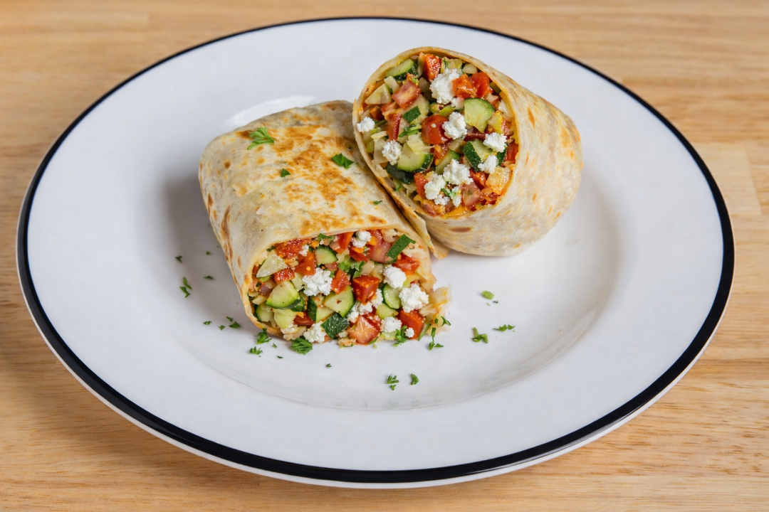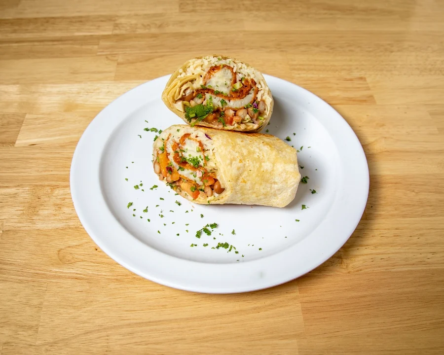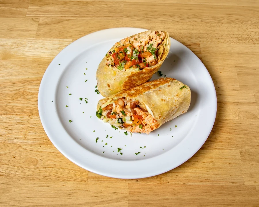 Grilled zucchini, tomatoes, onions, roasted red pepper and feta cheese. Wrapped in flour tortilla with basmati rice, pinto beans, lettuce, jack cheese and pico de gallo