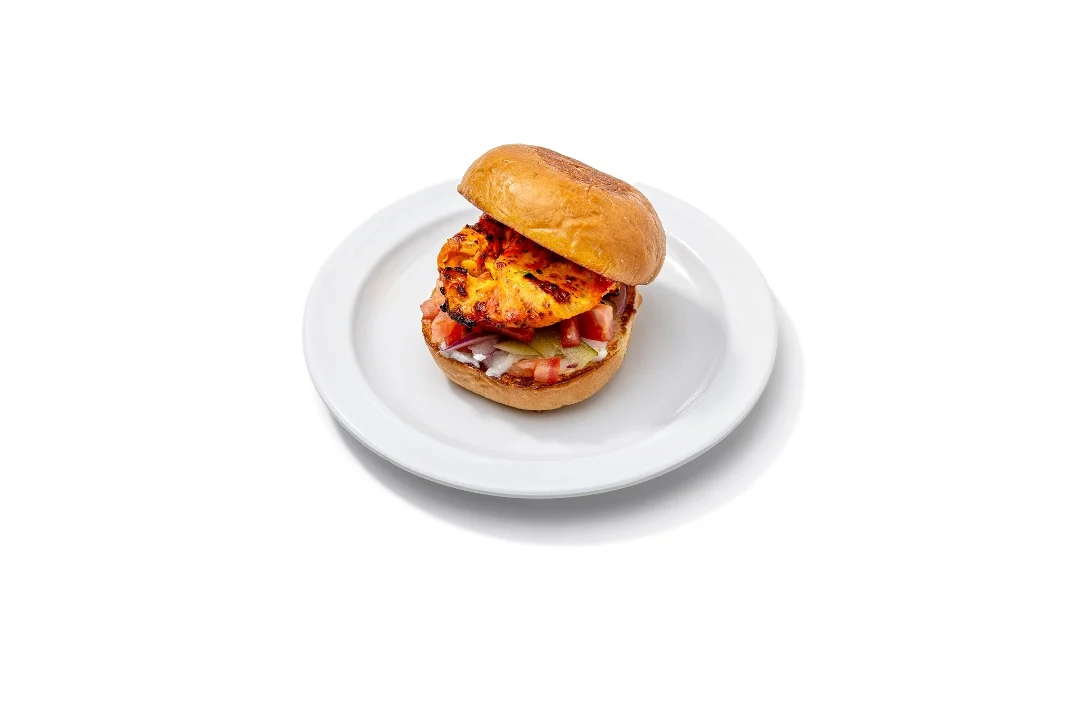 Grilled chicken on a brioche bun with pickles, onions, tomatoes and garlic sauce