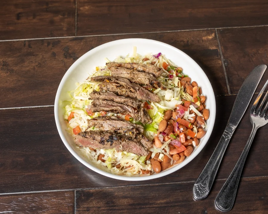 Char-broiled filet-mignon served on basmati rice, pinto beans, lettuce, jack cheese and pico de gallo
