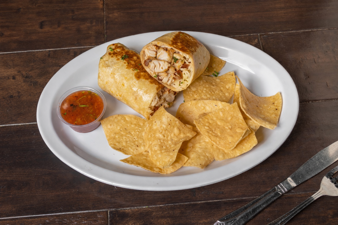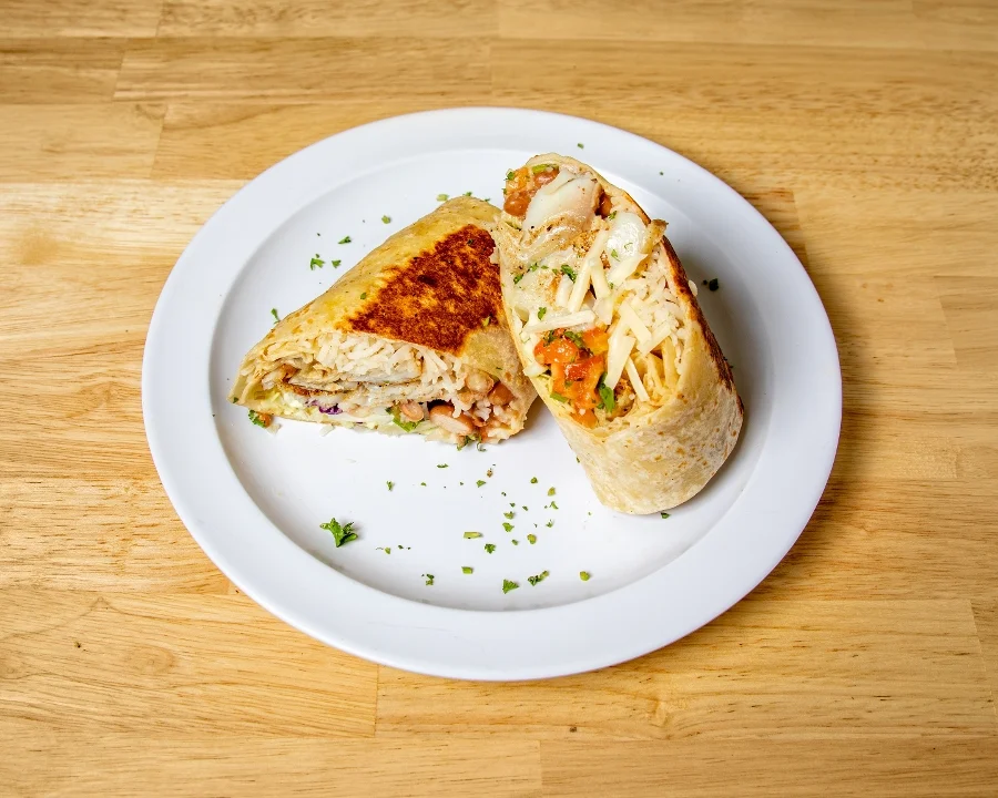 Grilled chicken wrapped in flour tortilla with basmati rice, pinto beans, lettuce, jack cheese and pico de gallo