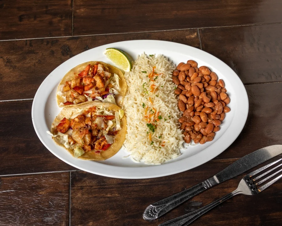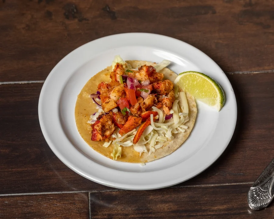Real lobster meat on a corn tortilla with Mojo sauce, cabbage, pico de gallo, garlic sauce and jack cheese