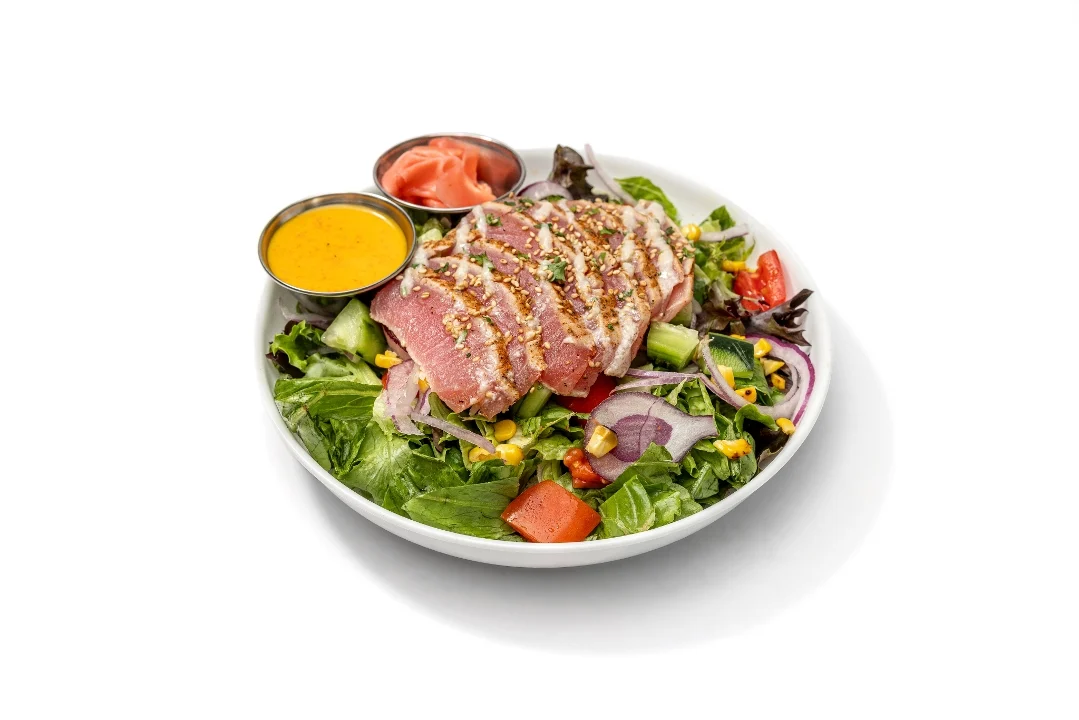 Sushi grade ahi tuna topped with ponzu, Mojo sauce and roasted sesame seeds. Served on mixed greens with tomatoes, cucumbers, red onions and fire roasted corn