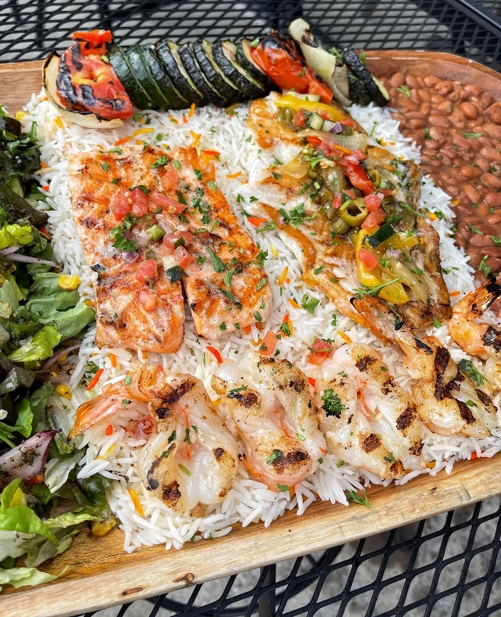 Grilled shrimp, grilled salmon and barramundi (Asian Seabass). Served with rice, beans, salad, tortillas, grilled veggies & topped w/spicy pico de gallo