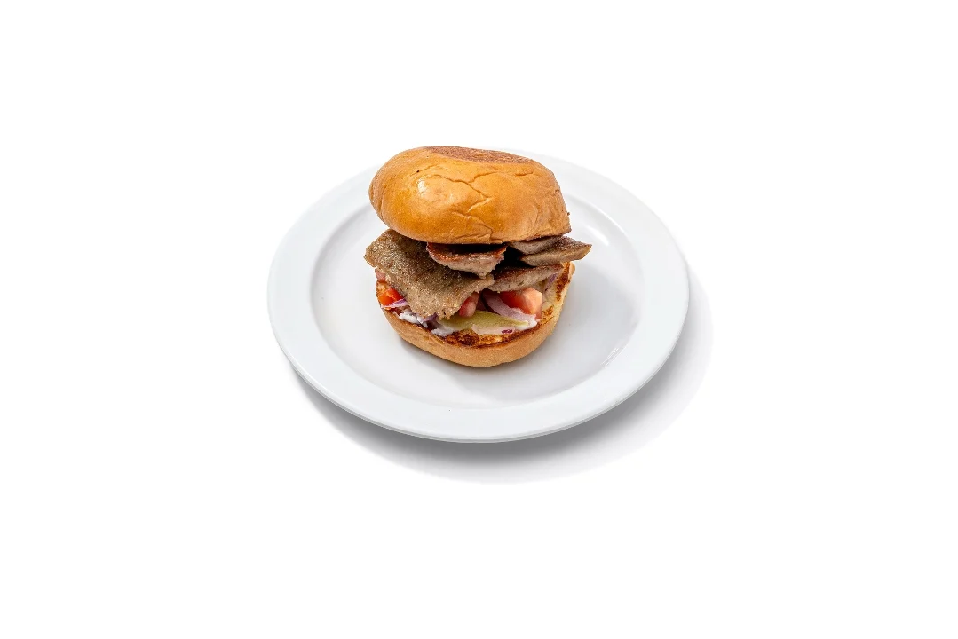Lamb gyro sliced off a vertical grill on a brioche bun with pickles, onions, tomatoes and garlic sauce
