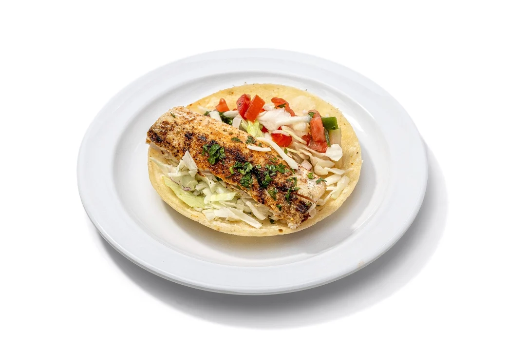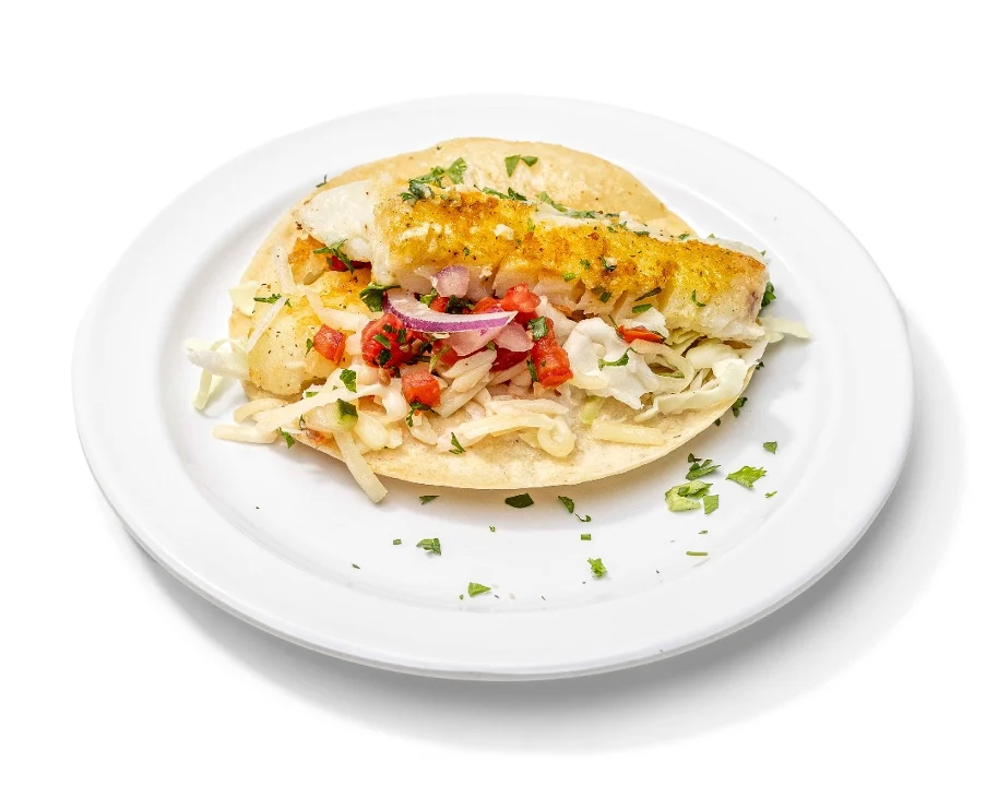 Grilled Alaskan cod on a corn tortilla with Mojo sauce, cabbage, pico de gallo, garlic sauce and jack cheese