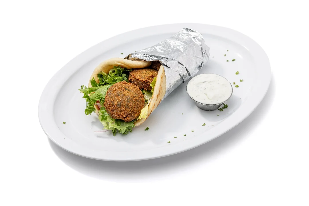 Falafel wrapped with mixed greens, tomatoes, red onions, pickles and garlic sauce. Falafel: garbanzo beans/chickpeas ground with veggies and fried in olive oil