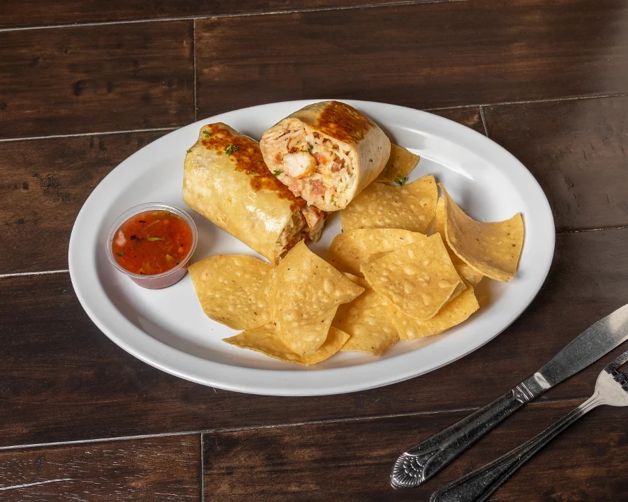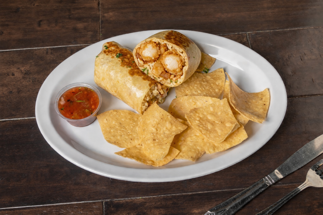 Grilled shrimp wrapped in flour tortilla with Mojo sauce, basmati rice, pinto beans, cabbage, jack cheese and pico de gallo