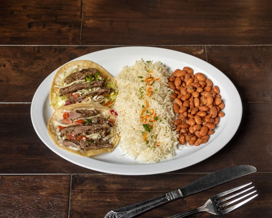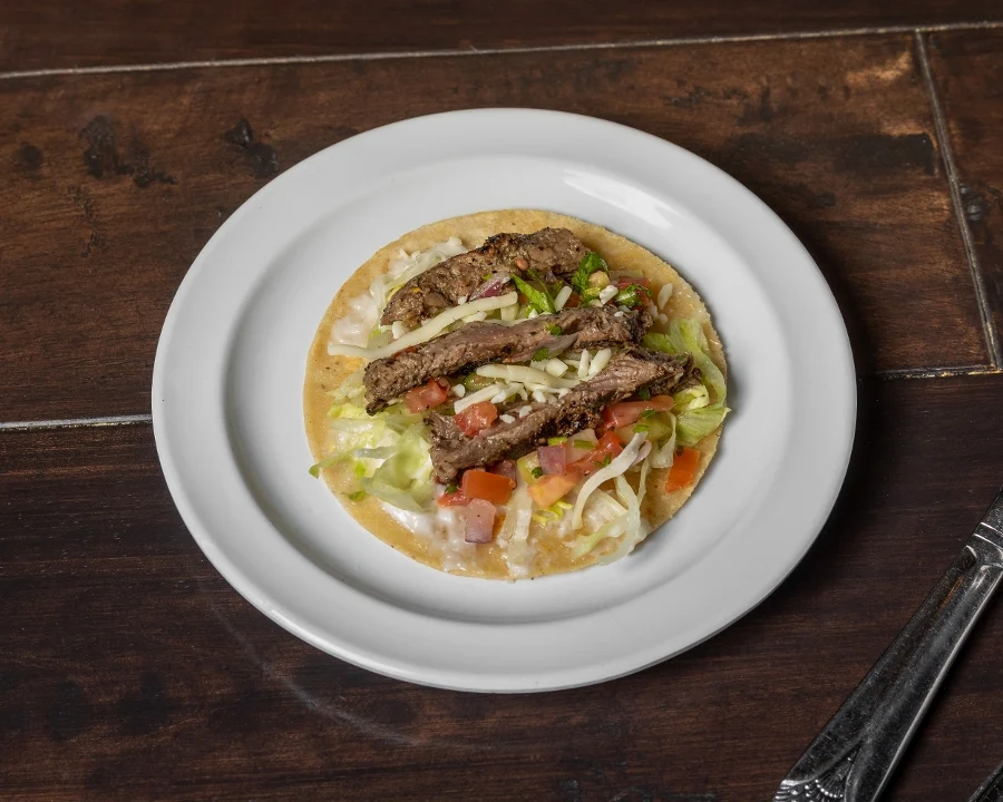Char-broiled filet-mignon on a corn tortilla with lettuce, pico de gallo, garlic sauce and jack cheese