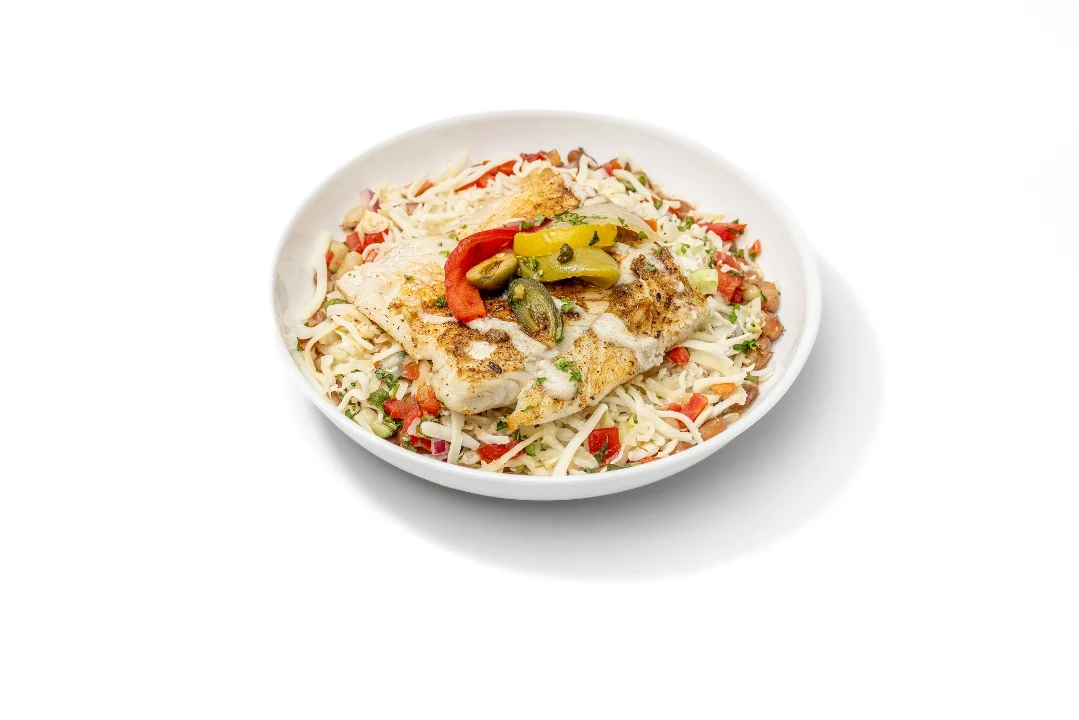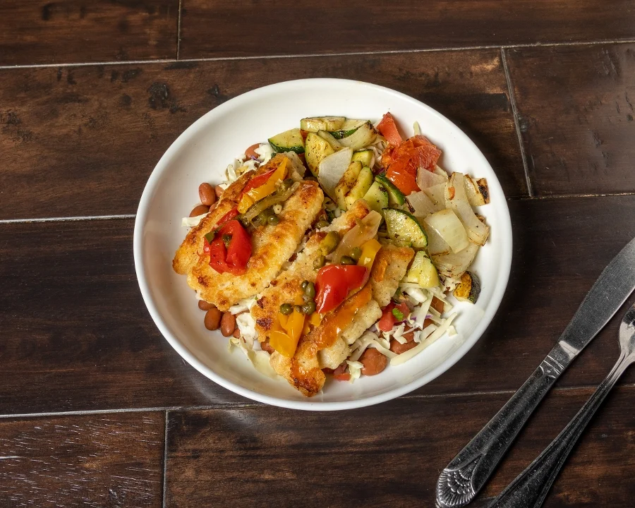 Grilled Alaskan cod on pinto beans, grilled veggies, pico de gallo, jack cheese & topped with Veracruzano sauce