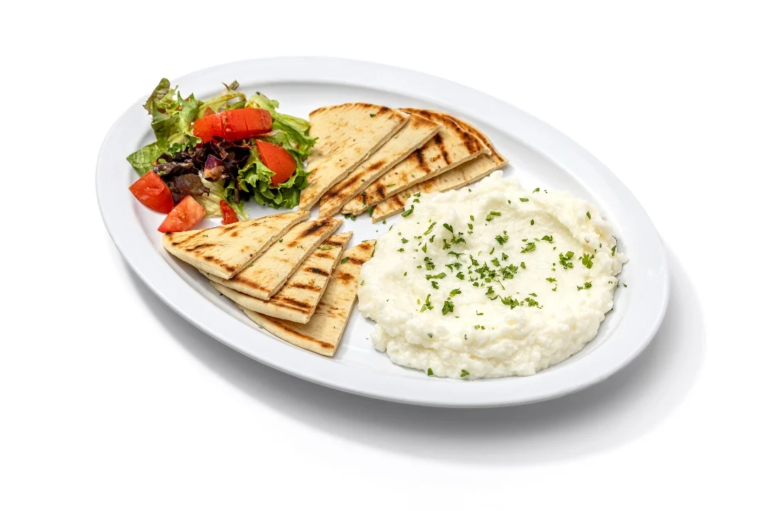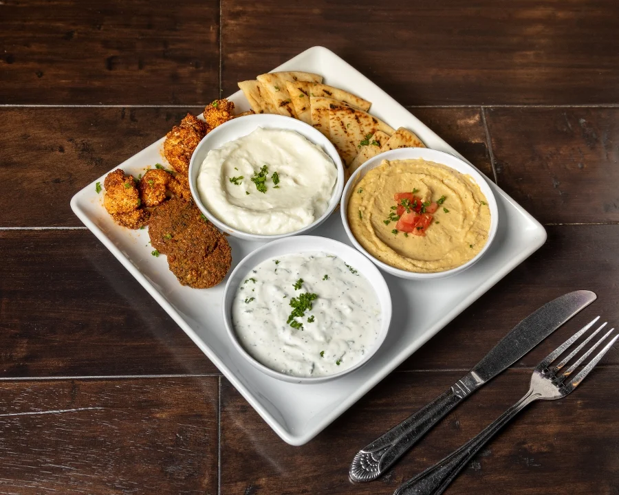 Perfect for sharing! A combination of our Mediterranean appetizers. Hummus, tzatziki, garlic sauce, falafel, dolma, fried organic cauliflower & grilled pitas