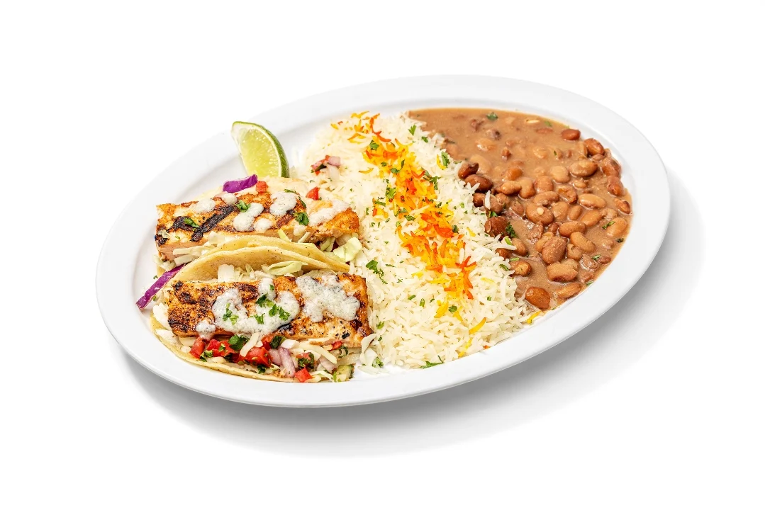 Grilled Alaskan Cod wrapped in flour tortilla with Mojo sauce, basmati rice, pinto beans, cabbage, jack cheese and pico de gallo