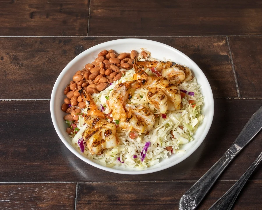 Four large grilled shrimp topped with Mojo sauce. Served on basmati rice, pinto beans, cabbage, jack cheese and pico de gallo