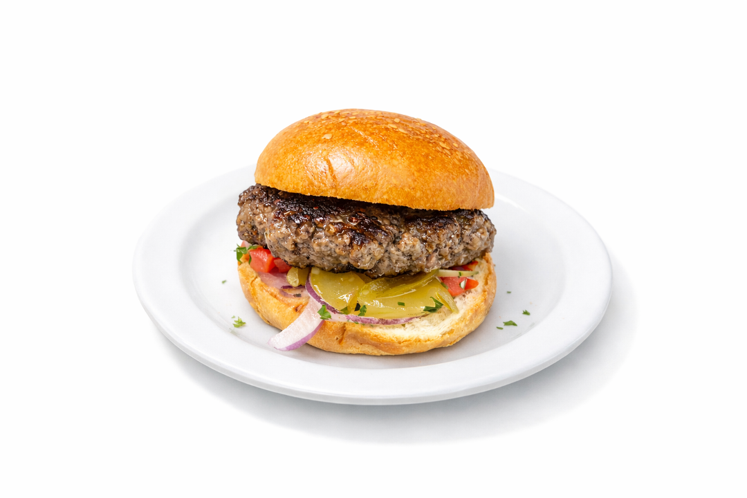Angus sirloin ground in-house on a brioche bun with pickles, onions, tomatoes and garlic sauce