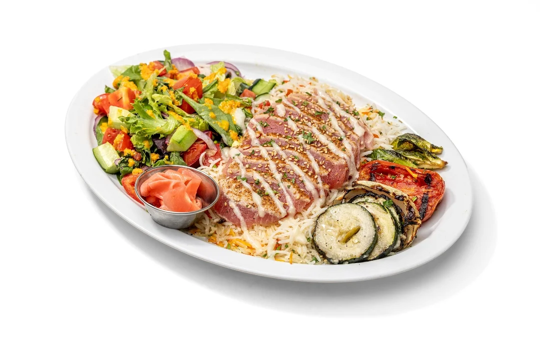 Seared sushi grade ahi tuna (rare) topped with Mojo sauce, ponzu and roasted sesame seeds. Served with basmati rice, grilled veggies and soy-ginger salad